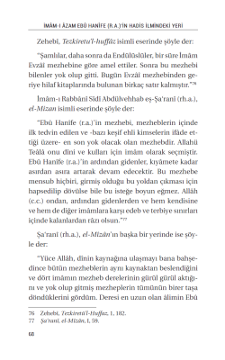 İmâm-ı Şâfii (r.a.) Hazretleri şöyle buyurmuştur: “Fıkıh, eser ve ictihâdlarıyla Müslümanların İmâmı Ebû Hanîfe, beldeleri ve insanları ma‘mûr etti. Onun gibisi doğuda, batıda ve Kûfe’de yoktur. İslâm’da fakîh olarak O, Resûllulâh (s.a.v.) ve Halîfeleri’nin sünnetlerini nûrunu bir imâm olarak dünyaya yaydı. Öyle ise Ebû Hanîfe’nin sözlerini inkâr edenlere, Allâh kumların sayısınca la‘net etsin.” Bu gerçekten hareketle neşrettiğimiz elinizdeki eser, hazreti İmam’ın seçkin menkıbelerinden bahsederken özellikle hadis ilmindeki ve Arap dilindeki otoritesini ortaya koymuş, cerh edilecek hiçbir yönünün olmadığını güçlü delillerle ve özet bir şekilde okuyucuya sunmuştur. Bu esnâda İmam-ı Azam’a hased edenlere de gerekli cevaplar verilmiştir. Aslında âlimler; “İmam-ı Azam’ı savunmak” tabirinden bile haya etmişler, onu suçluymuş gibi değerlendirip sonra onu savunmaya kalkmanın edepsizlik olduğunu, İmam-ı Azam’ın buna ihtiyacı olmadığını bildirmişlerdir. Birgün hazreti İmam’a “Alkame mi daha Esved mi daha üstün” diye sorulur. Hazreti İmam’ın cevabı İmamlarımız hakkında nasıl bir edebe sahip olmamız gerektiği konusunda bütün Müslümanlar için tam bir ders niteliğindedir: “Biz onların adını ağzımıza almaya bile layık değilken, nasıl olur da aralarında kıyas yaparız?”Hal böyleyken yine de, âlimlerimiz şüpheleri def etmek, tereddütleri ortadan kaldırmak ve anlamayan insanlara anlatmak için bu konularda yazmışlardır.